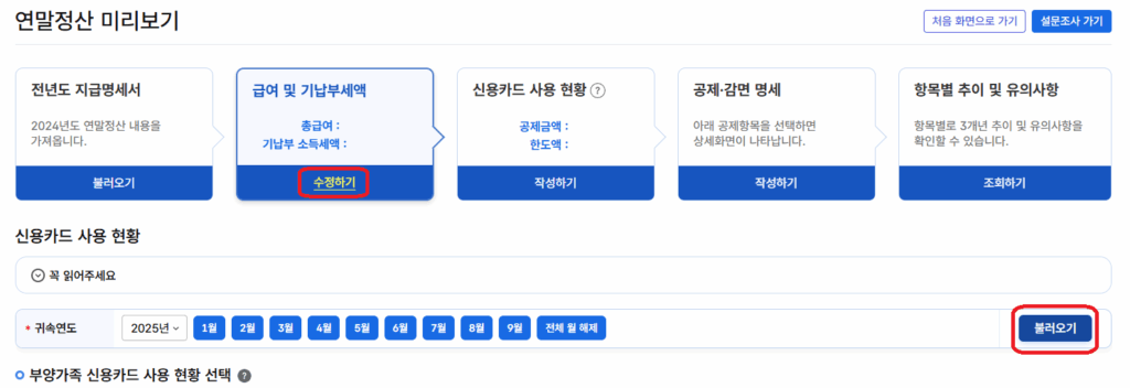 – 신용카드 사용현황 작성하기 누른 뒤 올해 사용내역 불러오기